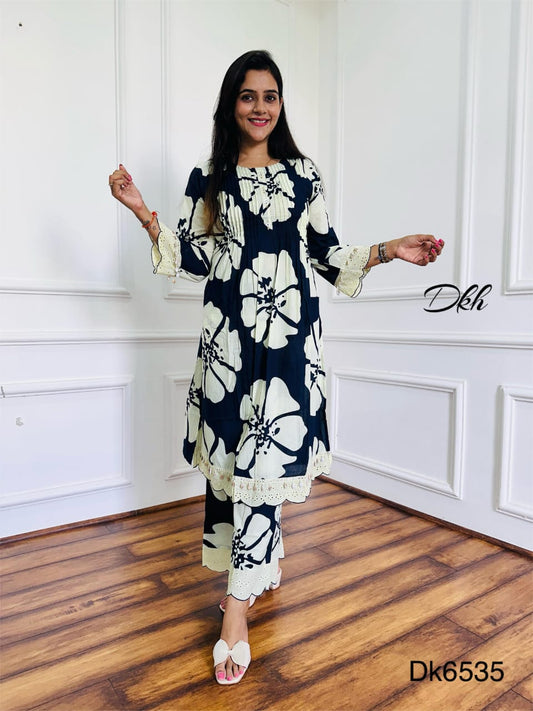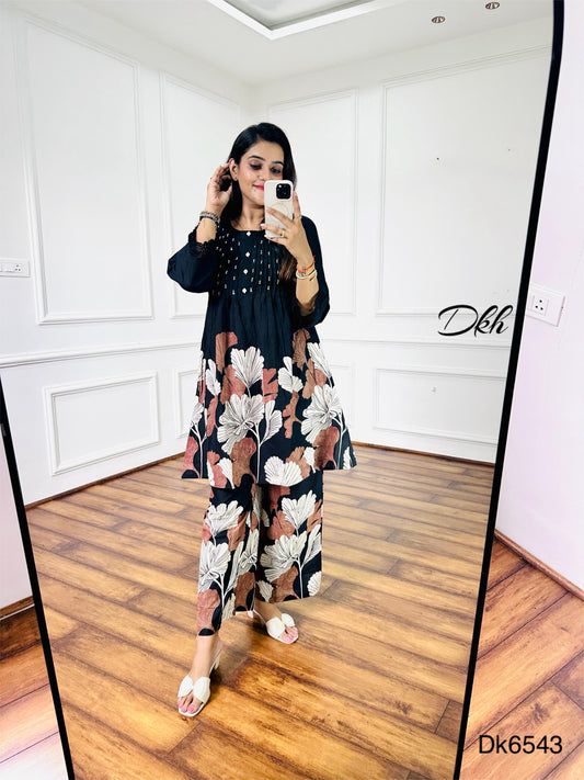 Black Cotton Kurti & Palazzo 2-Piece Set with Floral Print and Crochet Lace
