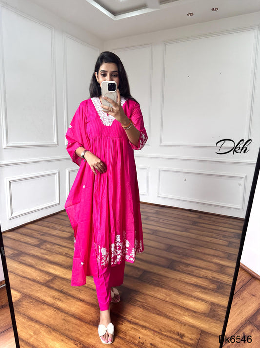 Bright Pink Mul Chanderi 3-Piece Suit Set with Embroidery