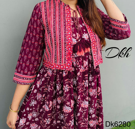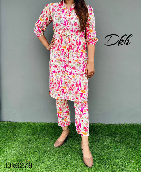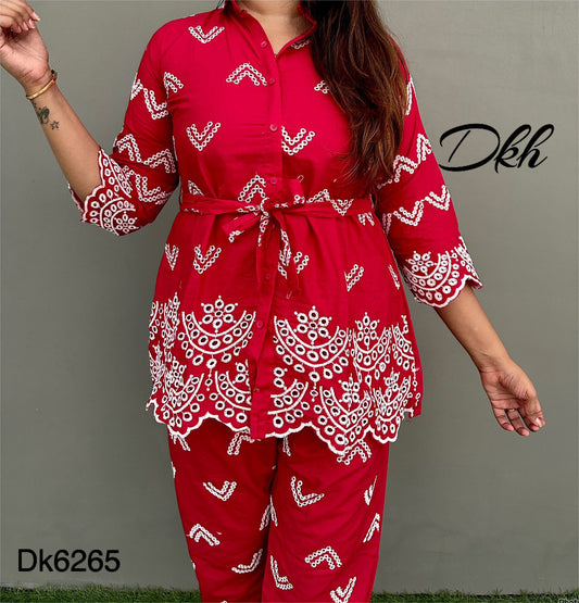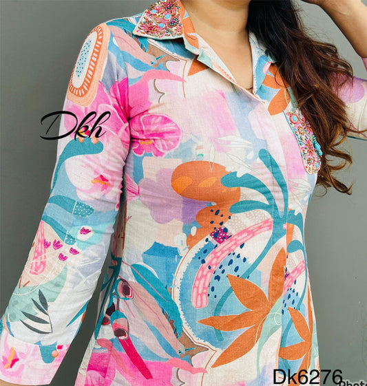 DK6276 Premium segment khadi cotton printed coord set with hi low style top having collar paired up with pants…