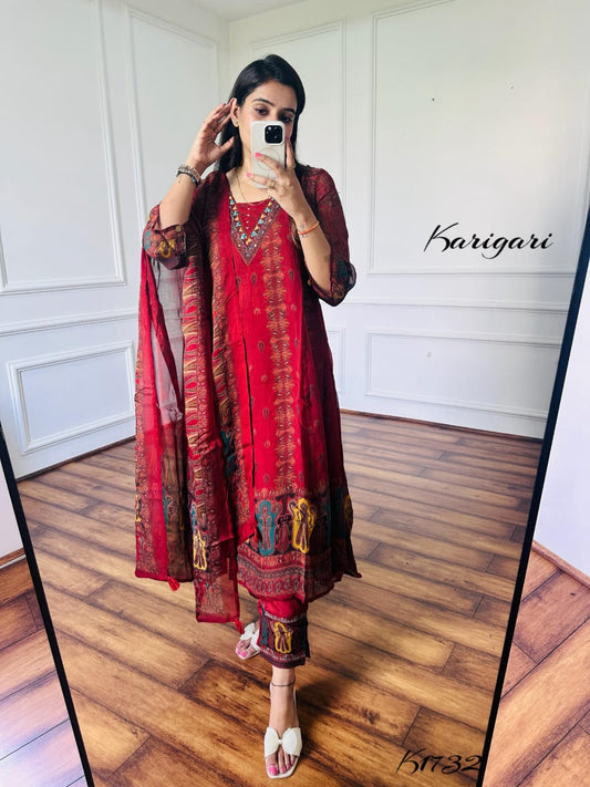 Trendy Rust Mul Chanderi 3-Piece Kurti Set