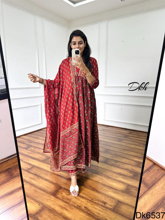 Kalamkari Special Rust Cotton 3-Piece Anarkali Suit with Bead & Sequin Detailing