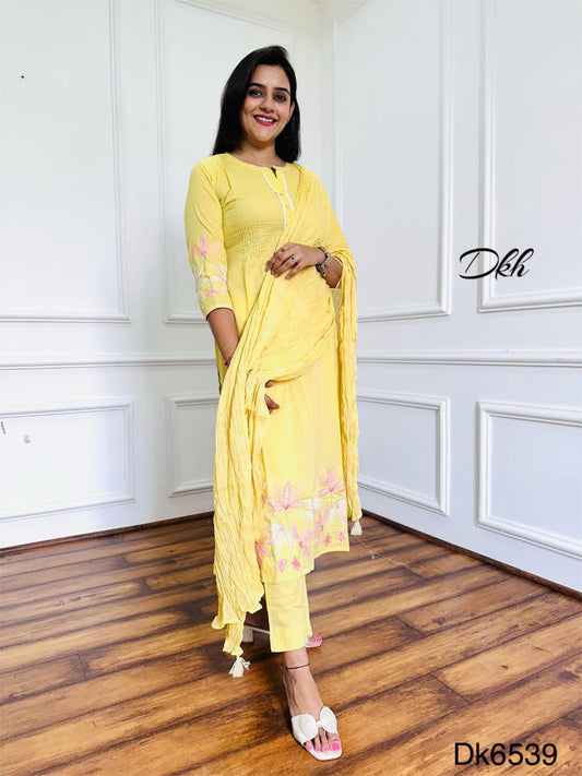 Elegant Yellow Cotton 3-Piece Suit Set with Embroidery & Crush Dupatta