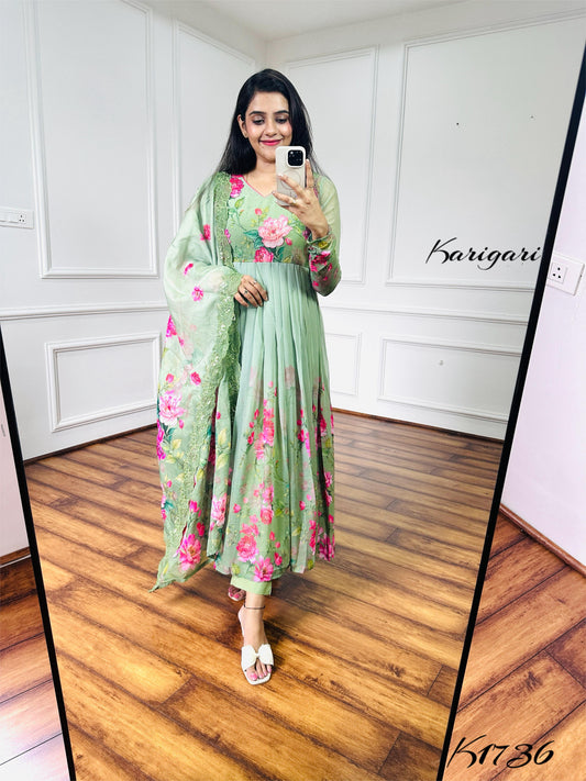 Elegant Mint Green Floral Chiffon Anarkali Suit Set – 3 Piece with Sequin & Bead Work