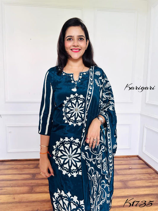 Pure Crepe Printed Suit Set with Zari, Sequin & Mirror Work – Navy Blue