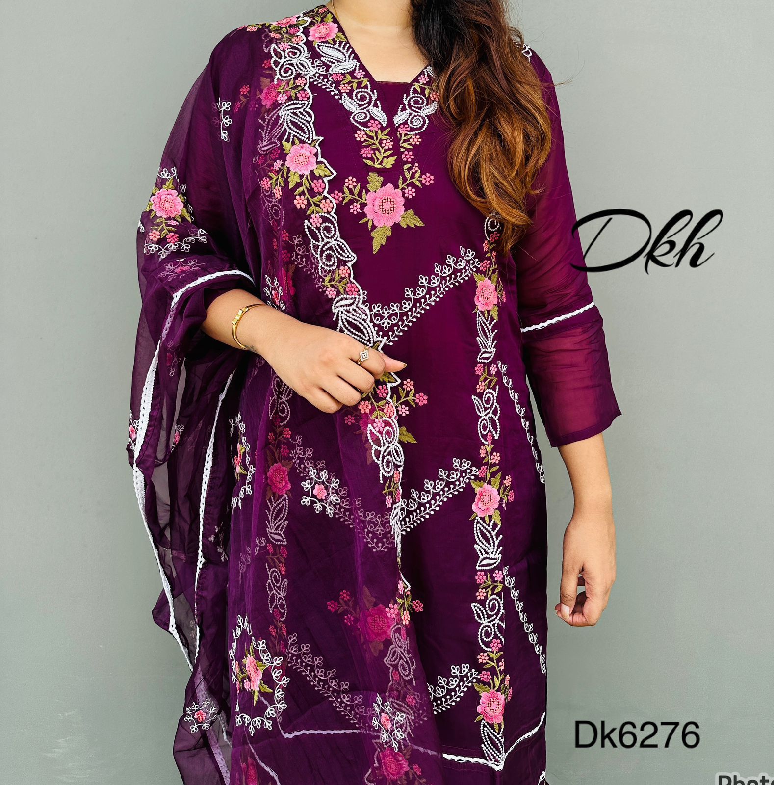 Premium organza 3 pc suit with lining and heavy emb n crocia lace detailing on kurti, dupata and on pants..
